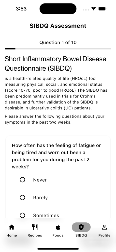 The IBD Digest utilizes the “Short IBD Questionnaire” (SIBDQ) to quantitatively measure user’s Quality of Life. Take the survey regularly to track scores and progress over time.